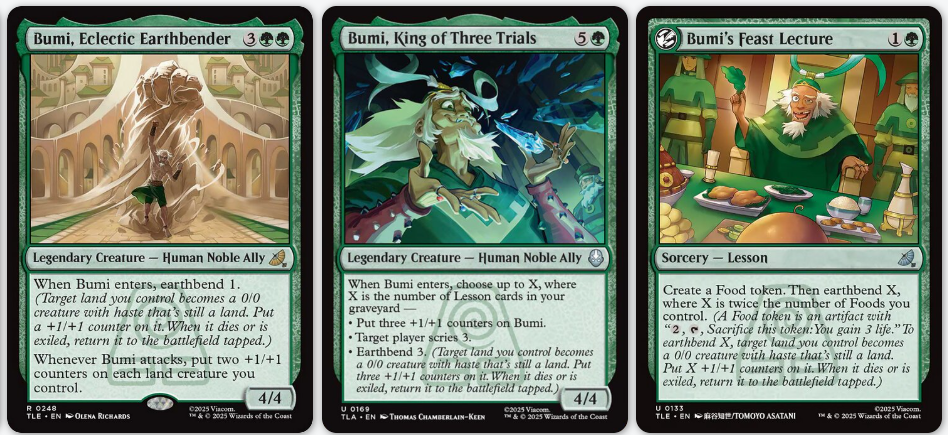 Earthbend je další klíčové slovo-akce následované číslem. Když máte provést earthbend X, zvolíte si svou zemi, ta se stane 0/0 bytostí a položíte na ní X +1/+1 žetonů, plus dostane haste. Můžete tak klidně oživit i zemi právě zahranou. V Ba Sing Se, hlavním městě Království země, prostě vyvolávací únavu neřeší.