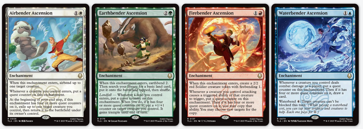 Několik karet odkazuje na Aangovy předchůdce – Rokua, Kyoshi, Kuruka a Yangchen. Pouze na Descendants' Path jsou všichni čtyři předchůdci, na druhých dvou chybí Yangchen, vládkyně větru. Bonusový Arcane Signet vypráví o momentu, kdy si Aang jako malý chlapec neomylně mezi tisíci hračkami zvolil čtyři předměty, které patřily čtyřem jeho předchůdcům, jeho minulým životům.