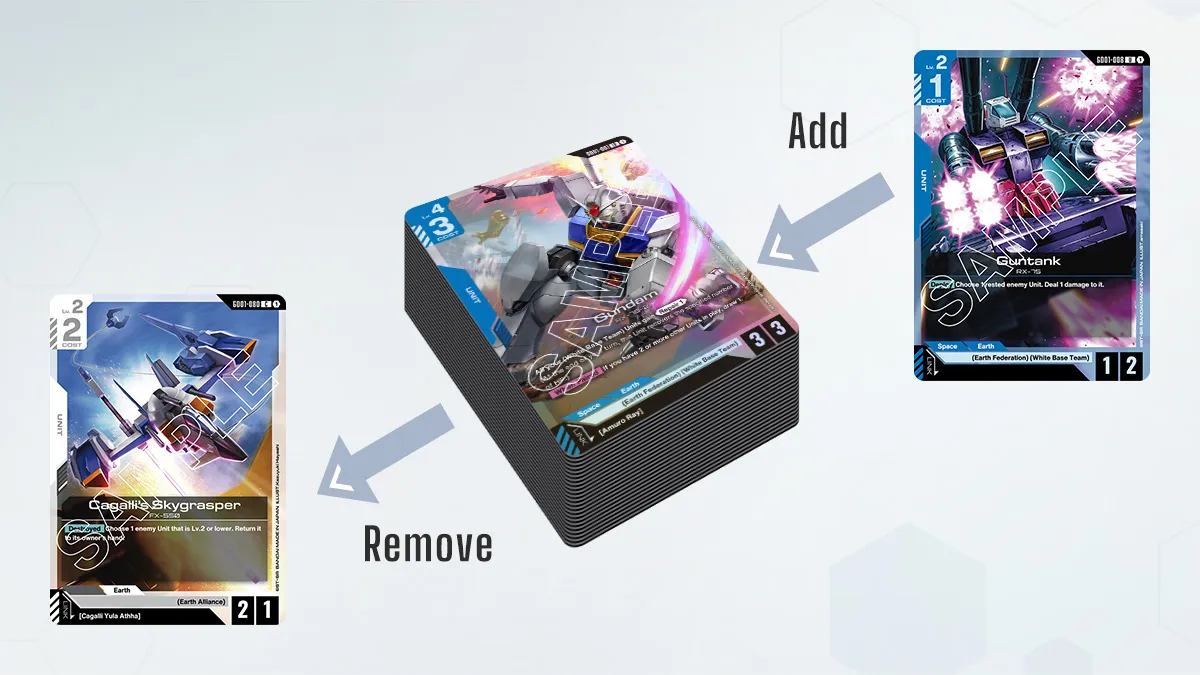 Hlavní balíček obsahuje přesně 50 karet, přičemž od jedné karty můžete mít maximálně čtyři kopie. V jednom decku lze kombinovat nejvýše dvě barvy. Resource deck tvoří přesně 10 Resource karet.