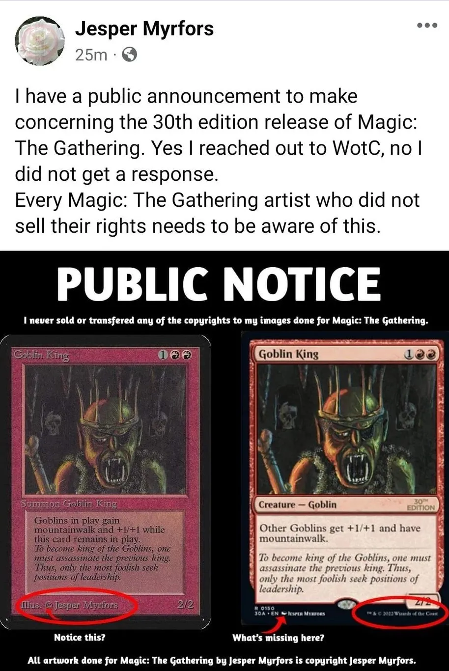 Myrfors k tomu v postu dodal následující: „Nikdy jsem neprodal ani nepřevedl žádná autorská práva ke svým obrázkům vytvořeným pro Magic: The Gathering. Veškeré umělecké dílo vytvořené Jesperem Myrfors pro Magic: The Gathering je chráněno autorským právem Jespera Myrforse.“ V době, kdy autor post zveřejnil, nedostal od Wizardů na toto téma odpověď. Jesper též vyzval ostatní výtvarníky Magicu, kteří neprodali svá práva společnosti, aby na věc upozornili. Myrfors se domníval, že šlo o přehlédnutí ze strany Wizardů. Dodal, že je zklamaný, nikoliv naštvaný. Uvedl, že zatím nepodniká žádné soudní spory.