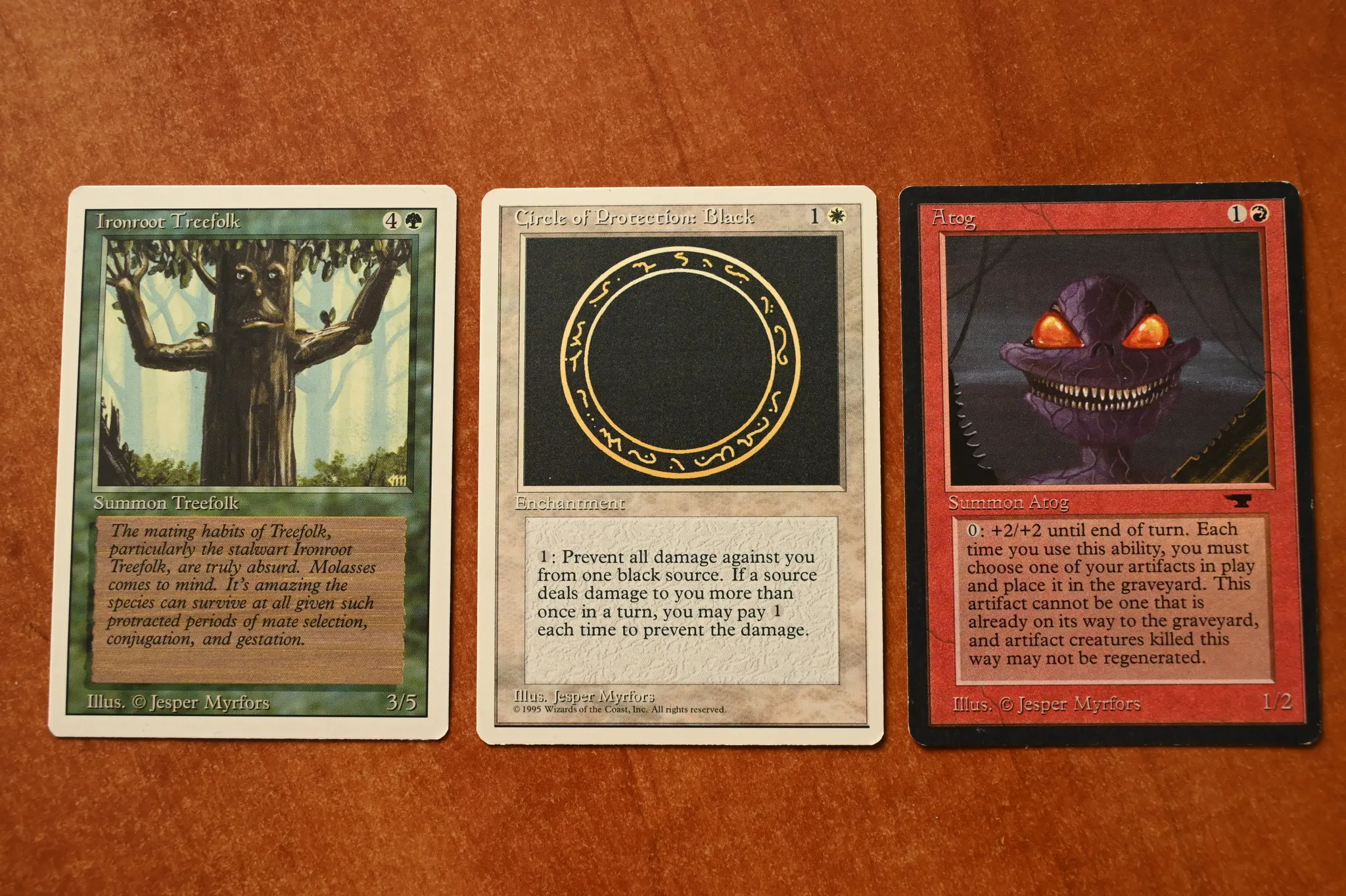 Ironroot Treefolk byla první ilustrace, která pro Magic: The Gathering vznikla — a stál za ní Jesper Myrfors. Autor dokončil zelený okraj karty a chtěl vidět, jak v něm bude vypadat ilustrace. Byl to test, aby se zjistilo, zda okraj funguje. Myrfors v příspěvku vzpomíná, že v té době nemohl jen tak online hledat patterny, které by v rámečku otestoval. Ironroota namaloval, naskenoval, upravil barvy a umístil jej do rámečku. Z výsledku byl dle vlastních slov nadšený. Následně mu přicházely objednané ilustrace k dalším kartám; skenoval je, upravoval barvy, vkládal do rámečků a na obrazovku počítače, aby viděl, jak budou pohromadě vypadat. Myrfors vzpomíná: „Seděl jsem u počítače, dlouho se na karty díval a měl jsem hloupý úsměv ve tváři. Věděl jsem, že se mi to podařilo. Když jsem výsledek ukazoval ostatním lidem ve firmě, reakce byla u všech pozitivní. Jako celek to fungovalo a nevypadalo to jako nic jiného, co se na trhu vyskytovalo. Bylo to skvělé! Naplnil jsem důvěru, která mi byla svěřena.“