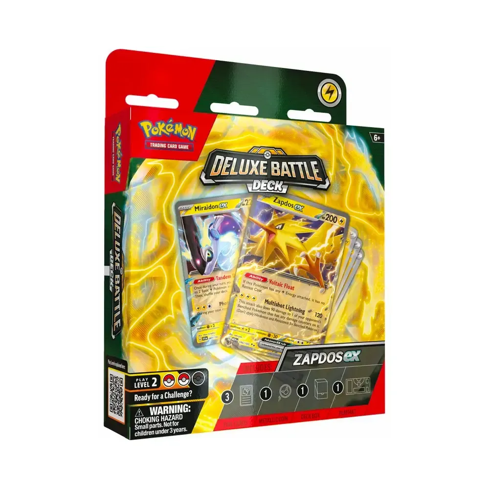 Deluxe Battle Deck se Zapdosem ex je silnější, hotový balíček určený pro hráče, kteří už mají s Pokémon TCG nějaké zkušenosti a chtějí posunout svou hru dál. V balení je kompletní 60karetní deck zaměřený na Zapdose ex, herní příslušenství jako mince, žetony, podložka, průvodce strategií a také kód pro online verzi hry – vše připravené rovnou k použití.