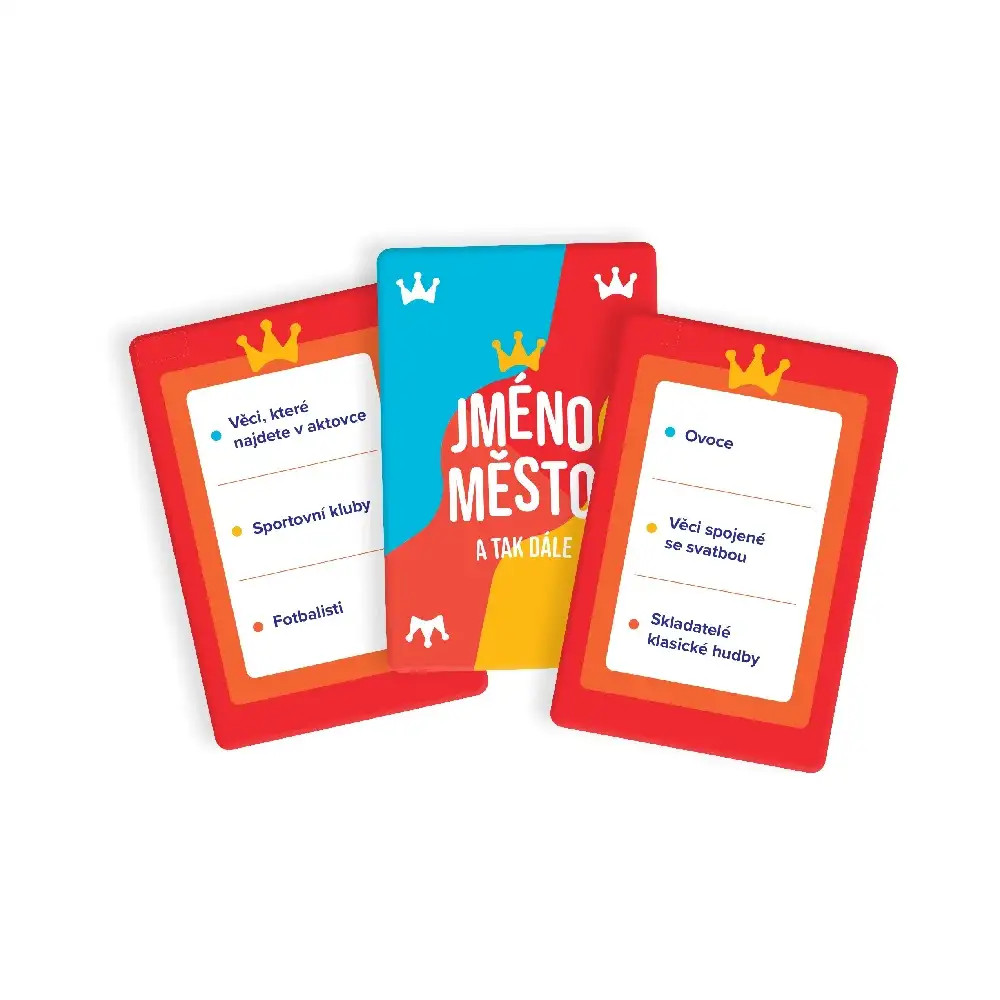 Jméno, město a tak dále je karetní verze oblíbené dětské hry, kde hráči na dané písmeno vymýšlejí slova do různých kategorií. Místo papíru a tužky se ale používají karty s písmeny a kategoriemi, což hru zrychluje a zpřehledňuje. Vyhrává ten, kdo pod tlakem času vymyslí nejvíc správných slov.