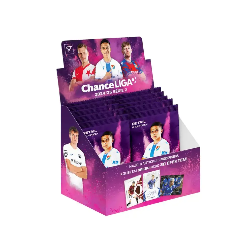 Retail box Chance Liga 2024/25 – 2. série je fotbalový box sběratelských karet Sportzoo zaměřený na českou Chance ligu. Uvnitř najdete mix základního setu a tematických insertů jako Aurora Spark, Cosmic Pink, New Beginning nebo Club Icons, a navíc je v každém boxu garantovaná jedna větší speciální karta – může jít třeba o limitovanou verzi, kartu s podpisem nebo kouskem dresu.