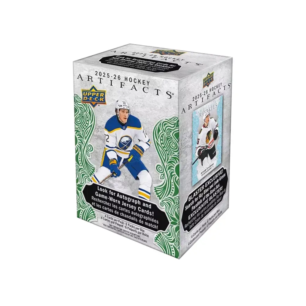 Artifacts je série, která působí o něco sběratelštěji a "dospěleji", a Artifacts Hockey Blaster Box tak představuje fajn kompromis mezi cenou a šancí na zajímavé úlovky. Obsahuje 6 balíčků po 4 kartách a nabízí možnost najít paralelky jako Jade Green /100 nebo Sky Blue, což dává sběratelům jasný důvod zkusit štěstí – i z menšího balení může vypadnout karta, která sbírku opravdu ozvláštní.