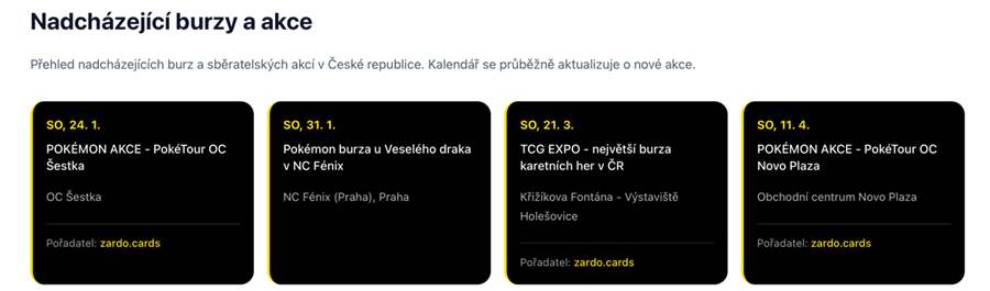 - kalendář sběratelských akcí – burzy, setkání a další Pokémon TCG akce po celé ČR