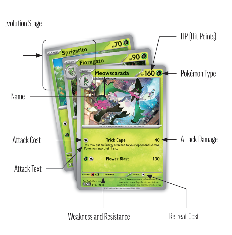 - Stage 1 a Stage 2 Pokémoni: evoluce Pokémonů, které jsou silnější, ale vyžadují předchozí fázi.