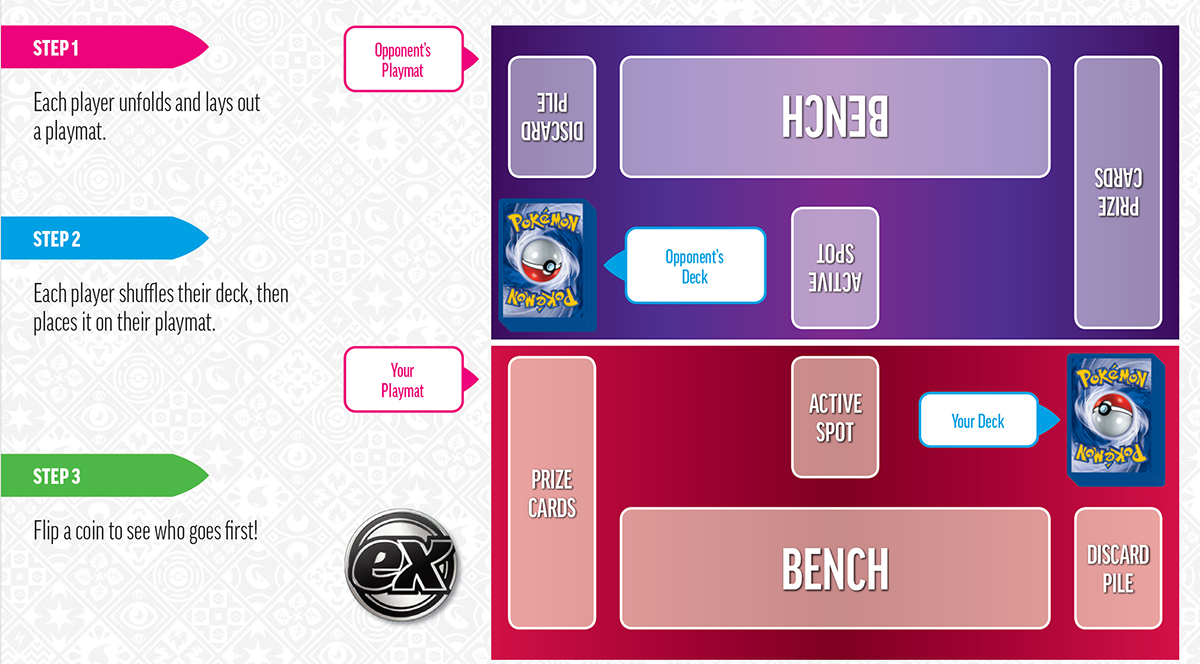 Pro lepší přehlednost doporučujeme použít herní podložku (playmat), která zobrazuje zóny pro aktivního Pokémona, lavičku, odhazovací balíček i Prize karty.