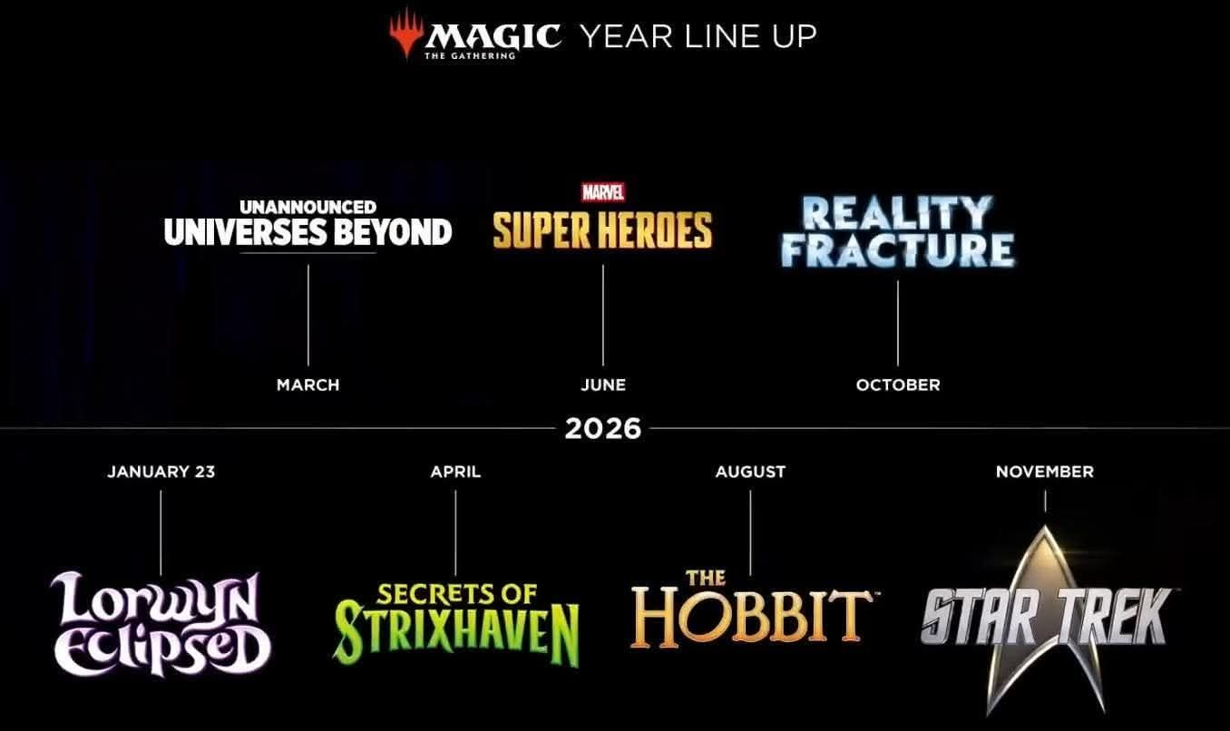 Najednou ty vesmírné lodě dávaly smysl. O Hobitovi si už nějakou dobu cvrlikali vrabci na rokytě a o návratech na Lorwyn (byť posunutém na Q1 2026) a Arcavios (domov akademie Puštíkov (Strixhaven)) jsme věděli. Finále tříletého super-oblouku dostalo jméno Reality Fracture, což dává smysl v kontextu vývoje příběhu Tarkir: Dragonstorm. Překvápkem tedy byly Universes Beyond sady kromě Hobita. Marvel Super Heroes nebyl překvapením až takovým – po The Soul Stone bylo jasné, že nějaká další Marvel sada přijít musí. Zde zatím utajený set byl oznámen krátce poté, ale už poměrně přesvědčivě podle indicií uhodnut hráči dopředu jako TMNT, aka Želvy ninja. Tou největší peckou byl poslední oznámený set – Star Trek. Smysl to ale opět dávalo dokonalý – příští rok slaví Star Trek šedesáté výročí vzniku a k té příležitosti vznikají různé IP crossovery, viz nedávno například s Legem.