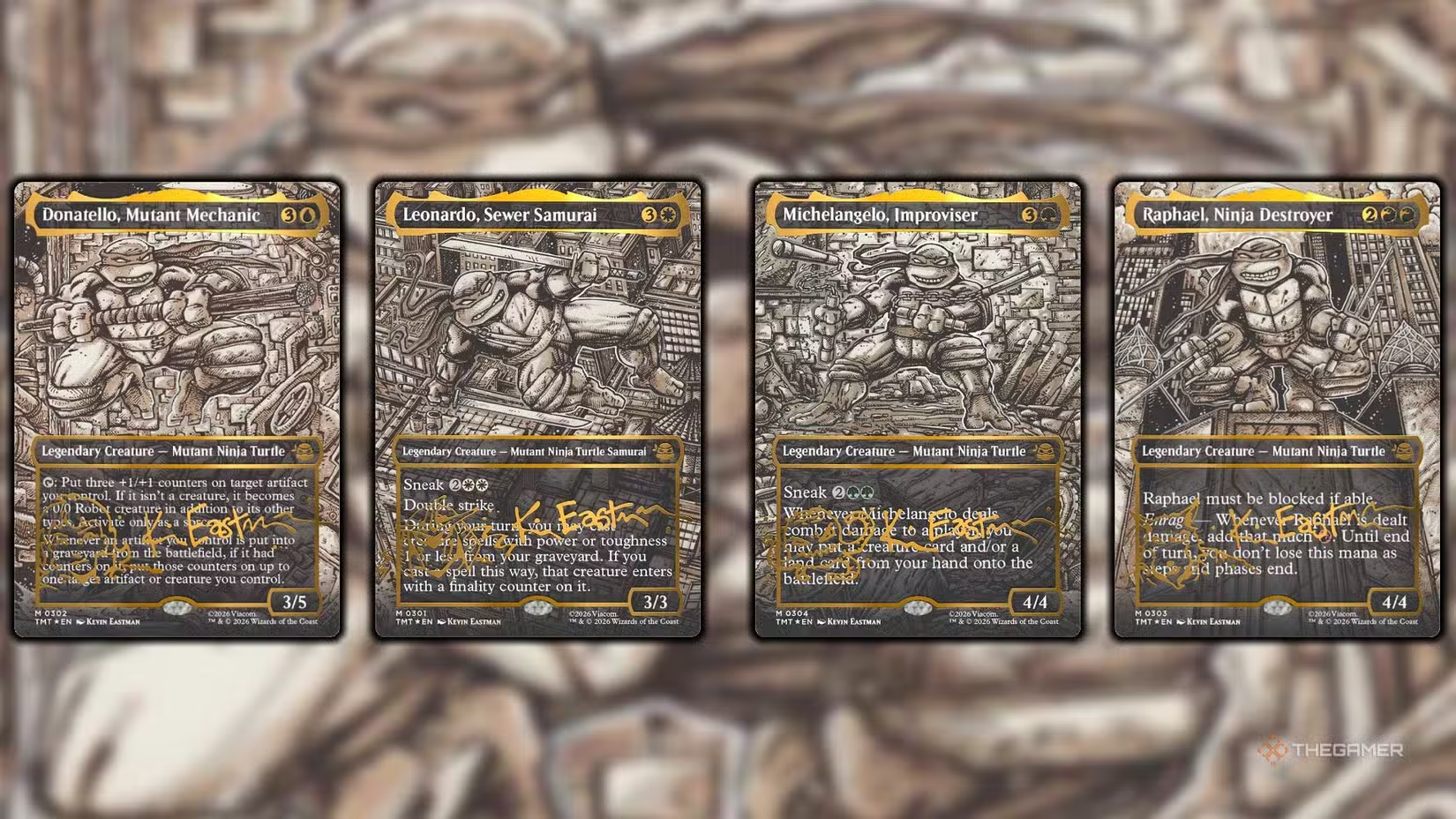 Headliner karty jsou tentokrát hned 4, všechny s ilustrací od tvůrce Želv Kevina Eastmana. Vždy jsou serializované, v double rainbow foil provedení, pouze v Collector Boosterech a pouze anglicky, nezávisle na jazyku produktu.