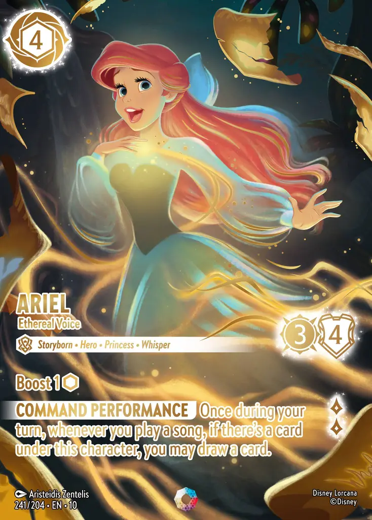 Do oranžové se opět vrací písničky. Je opravdu možné, že bychom se dočkali oživení Steelsong balíčků? Napovědět nám může samotná Ariel, Ethereal Voice, která, pokud jste ji boostnuli, vám lízne kartu každé kolo, ve kterém zahrajete písničku. K ní může být zajímavou variantou i Mickey Mouse, Amber Champion, který, pokud máte ve hře ještě dvě jiné oranžové postavy, získá schopnost Singer 8, díky čemu můžete už v 5. kole pomocí jedné postavy zazpívat písničku Circle of Life z předchozího setu!