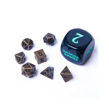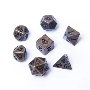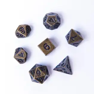 A set of seven metal micro polyhedral dice. Contains a d4, d6, d8, d10, d12, d20, and percentile d10.
