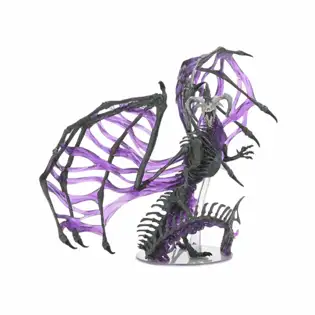 The D&D Icons of the Realms: Black Dracolich Boxed Miniature is a Gargantuan-sized prepainted Dungeons & Dragons miniature on a 100mm clear plastic base. Utilizing haunting purple translucent materials and standing over 8 inches inches tall, this undead dragon mini makes for a great campaign antagonist or frightening addition to your collection.