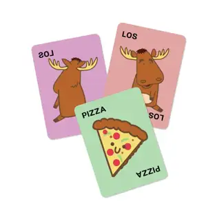 The entire deck is split between 2-8 players, who then place their individual stack of cards face-down in front of them. Each person takes a turn flipping a card face-up on a pile in the middle while saying the words “Taco,” “Cat,” “Goat,” “Cheese,” “Pizza” — in that order. If the card in the middle matches the word being spoken, the players race to slap their hands down on top of all the cards. Whoever is last must add the entire stack to their own set of cards. The winner is the person who gets rid of all their cards first.