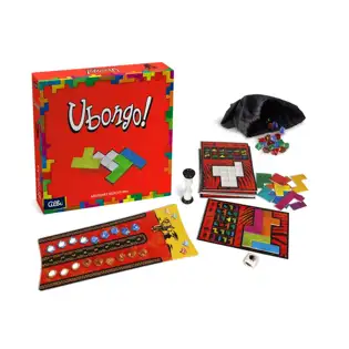 Ubongo is a timed puzzle game. It consists of 9 rounds in which players receive a puzzle card that shows a shape that the players have to create with pieces they have at their disposal. The fastest player is rewarded the most each turn.