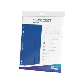 Ultimate Guard 18-Pocket Side-Loading Pages are double-sided insert sheets designed for binders with D-ring mechanisms. They are made from durable semi-transparent material and feature reinforced 11-hole punching, which increases mechanical durability with frequent use.