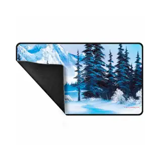 Every day can be a good day with Bob Ross tabletop accessories! Add some joy to your game space with the Winter Paradise black stitched playmat, featuring a Bob Ross original painting capturing the essence of winter’s tranquility in a peaceful and pristine snowy landscape mountain in the background and frosted trees. Each playmat is made with a soft fabric top to reduce damage to cards and features black stitched edges for an extra special premium feel. The non-slip rubber backing keeps the playmat from shifting during use. With dimensions of approximately 61 x 34,3 cm, this playmat also makes an excellent oversize mousepad for home or office.