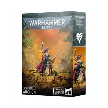 This multipart plastic kit builds one Archon, a cruel and sadistic leader for your Drukhari armies in games of Warhammer 40,000. They specialise in leading realspace raids and claiming captives to be taken back to the dark city of Commorragh. The Archon can be equipped with your choice of soul trap, blast pistol, or splinter pistol, and agoniser, huskblade, or master-crafted power weapon. There are two different options for the chest, three heads, a choice of two belts, and a striking scenic base. No matter how you build them, their dynamic pose and sinister details will look fantastic whether leading your army to victory or being worked on at your painting table.