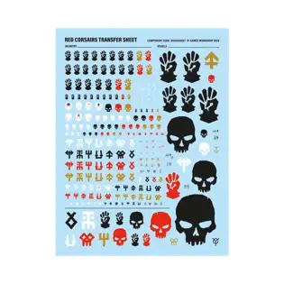 This kit is also supplied with 1 Red Corsairs Transfer Sheet, featuring 248 high-quality waterslide transfers. These include a selection of infantry and vehicle-sized transfers depicting Red Corsairs iconography, skulls, kill tallies, and other cursed sigils.