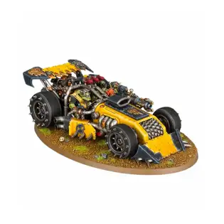 The Shokkjump Dragsta combines two of the foremost triumphs of the Mekaniak’s art – recklessly fast speedsters and deranged weaponry. It is perhaps unsurprising that it has become one of the most popular forms of transport amongst the Mekboyz of the Kult of Speed.