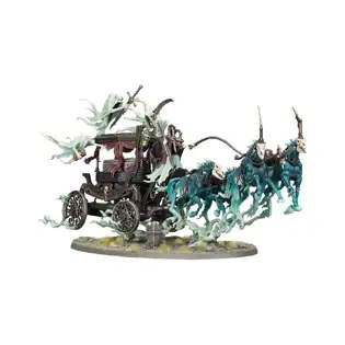 The Black Coaches are funerary carriages from the underworlds. Within these arcane carriages any tangible remains are gathered in a casket that offers a safe haven in which the banished entity can reform. The dormant occupant can feed upon the energies of death, drinking in agony and grief in order to grow strong. On first tasting death, the Black Coach speeds forward before shimmering jets of balefire extend from the wheels, acting like scythes to cut down enemies. When the coach is immersed in sufficient energies it flickers, allowing it to disappear and reappear in more advantageous positions. Onwards it rolls, growing ever more powerful until it becomes a nigh-unstoppable force of death.