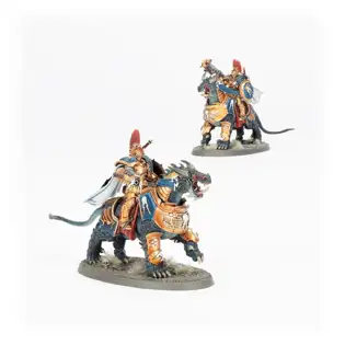 This multi-part plastic kit contains all the components necessary to assemble two Dracothian Guard Desolators, armed with thunderaxes and sigmarite shields and each mounted on a ferocious Dracoth.