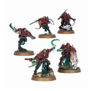 This multipart plastic kit builds five Mortis Reapers, deadly assassins for your Ossiarch Bonereapers armies in games of Warhammer Age of Sigmar. Clad in ragged robes, they rush into combat with enemy leaders and cut them down with lethal reaper's blades, before tossing down necrocaches – flesh-melting grave sand bombs – and leaping away. There are parts to build an optional champion, and each other Reaper can be assembled with a second blade or a necrocache billowing smoke. The kit also comes with 16 interchangeable necrocaches that can be added to the belts of your assassins.