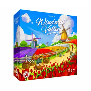 In Windmill Valley , a game inspired by the Bloemen Route, you and up to three players take on the role of tulip farmers and entrepreneurs. You will build and enhance your windmills, look for new tulip bulbs in foreign trades or among local vendors to buy and plant, and try to get an edge with hired help and lucrative contracts. Let your blooming fields make your competitors green with envy!