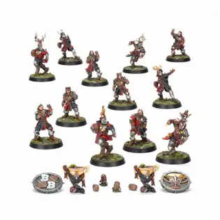 - 12 červených plastových hráčů Bretonnian týmu: 6x Bretonnian Squire Linemen, 2x Knight Catchers, 2x Knight Throwers, and 2x Grail Knight Blitzers, plus mince, žetony přehazování a extra míče