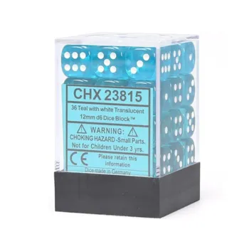 Chessex sada 6-stěnných kostek 12mm – Translucent Teal/white (36 ks)