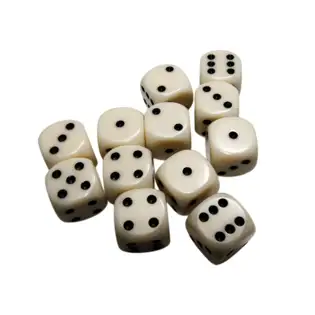 Sada 12 šestistěnných neprůhledných kostek o velikosti 16 mm, v barvě slonovinová/černá.