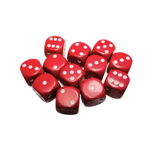 Sada 12 šestistěnných neprůhledných kostek o velikosti 16 mm, v barvě červená/bílá.