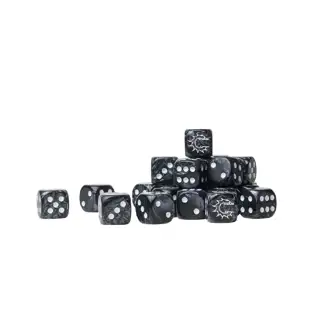 Sada 24 tmavě šedých kostek s bílými čísly. Kostky mají hranu o délce 16mm a logo Conquest místo jedničky.