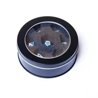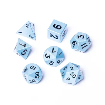 Sada sedmi kovových kostek obsahující d4, d6, d8, d10, d12, d20, a kostku na procenta.