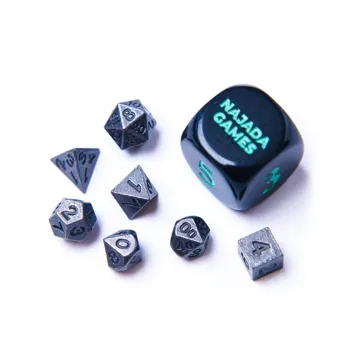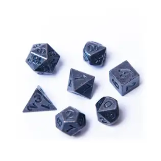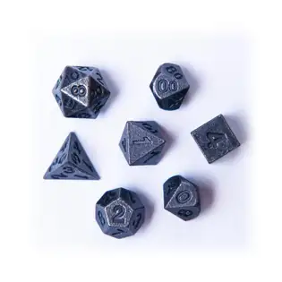 Sada sedmi kovových mikro kostek obsahující d4, d6, d8, d10, d12, d20, a kostku na procenta.