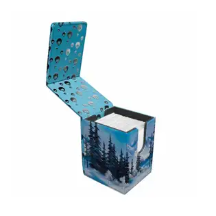 Každý den může být dobrým dnem s deskovými doplňky Bob Ross! Krabička na karty Winter Paradise Alcove Flip Deck Box je opatřena originálním krajinářským obrazem Boba Rosse na povrchu z koženky, takže si můžete vzít radost z přírody (a svůj TCG balíček!) kamkoliv s sebou. Tato krásná krabička zachycuje podstatu zimního klidu v pokojné a nedotčené zasněžené krajině s horami v pozadí a ojíněnými stromy. Je vybavena silným magnetickým zavíráním, které udrží vaše karty bezpečně uložené uvnitř. Deck Box pojme více než 100 sběratelských karet standardní velikosti v dvojitých obalech a má dva výřezy pro palec, které umožňují snadný přístup k balíčku.